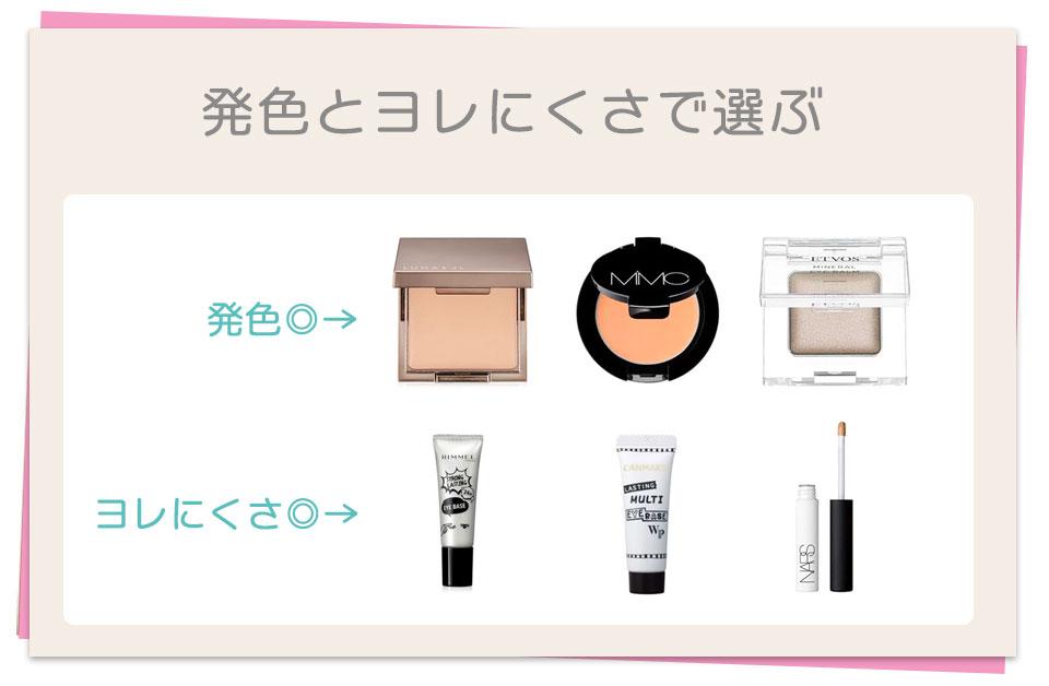 2〜3時間ほどのしっかりメイクのために選ぶなら、発色の良いアイテムを選び、仕事やイベントなど長時間のキープを目的とするなら、発色が控えめでもヨレにくいアイテムを選びましょう。