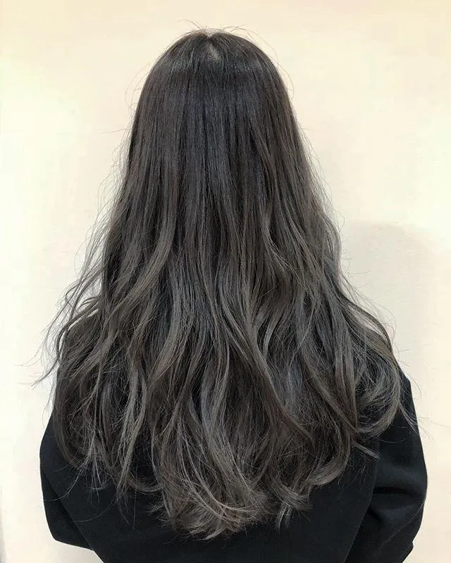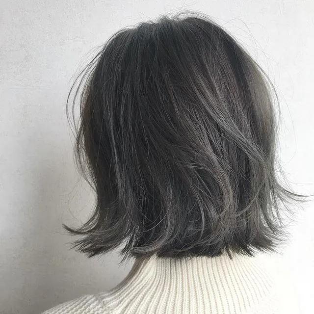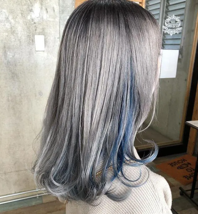 青みのアッシュとグレーでくすんだ灰色になり、赤みを感じない外国人風ヘアカラー。
