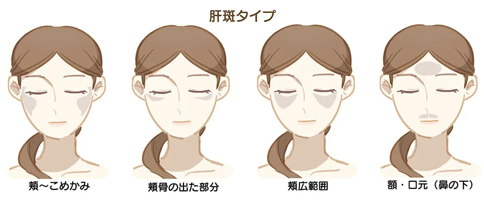 しかし30代~40代に多く見られるのは肝斑と呼ばれる薄茶色の色素沈着で、髪の生え際や目の下、頬や口元など左右同じ位置にできるのが特徴。