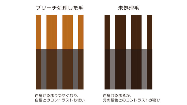 100%白髪で染まりの強さを比較すると、②のブリーチ処理を施した髪の方が染まりが強いことがわかります。