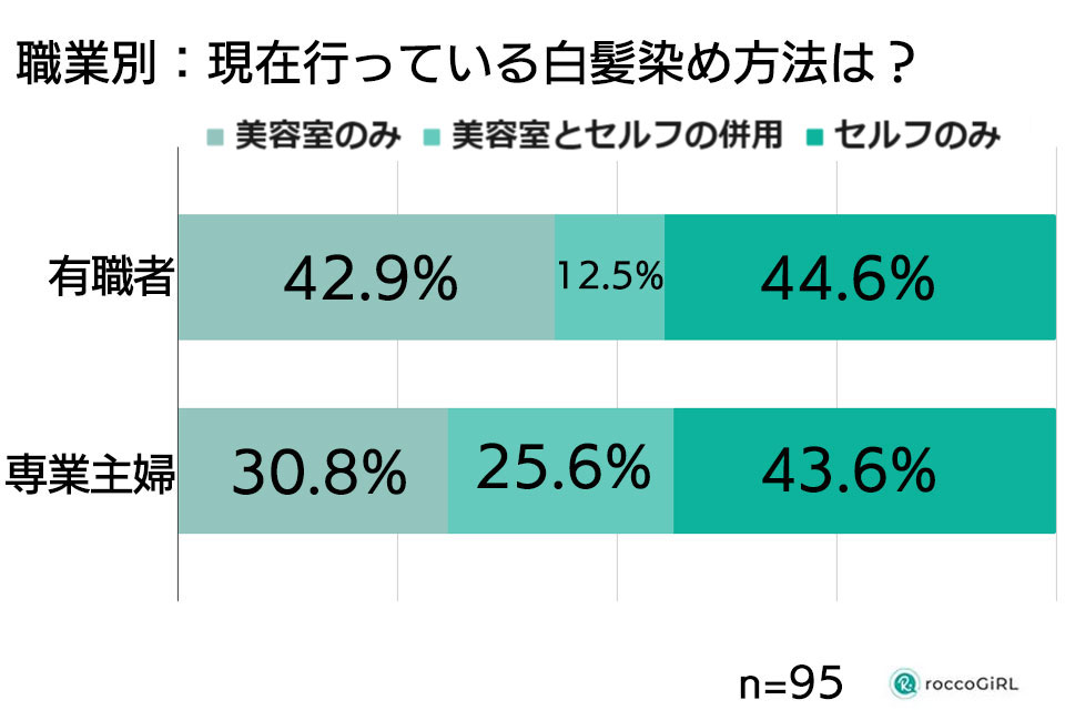 特に専業主婦の人は美容室とセルフ染めを兼用している割合が多く、賢く白髪と付き合っているようです。